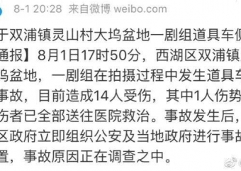 8月1日17时50分,西湖区双浦镇灵山村大坞盆地,一剧组在拍摄过程中发生道具车辆侧翻事故,目前造成14人受伤,其中1人伤势较重,伤者已全部送往医院救治。事故发生后,区委、区政府立即组织公安及当地政府进行事故现场处置,事故原因正在调查之中。