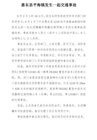8月2日1时45分许,经过各级党委政府和相关部门的通力协作,8月1日下午在惠东县X210线平海镇油麻园村路段出现的一起水泥槽罐车侧翻压倒两辆小车的交通事故结束。事件造成9人死亡(其中1人送院途中死亡,8人当场死亡),2人受伤。