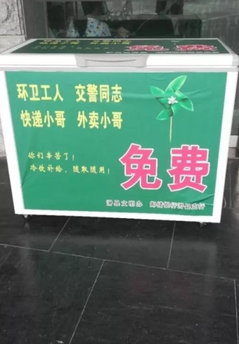 最近,在河南省滑县志愿服务总站、邮政储蓄银行解放路和人民路营业厅门口分别摆放着一个印有红色“免费”二字的爱心冰柜格外引人注目,近看,才发现是一句话:“环卫工人、交警同志、快递小哥、外卖小哥你们辛苦了,冷饮补给,随取随用。”这样的字眼让人感到