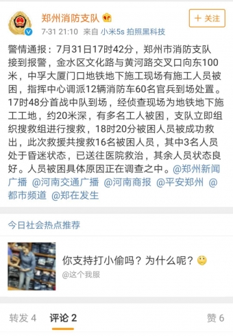 郑州地铁5号线发生安全事故 16名被困人员已救出送医