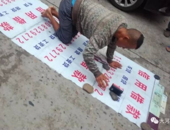 7月27日早上7点45分,在南部县大河镇四龙街一大早,一陌生男子肩扛编织袋选好位置,很熟练的摆放各种证件,准备装很恼火的样子,从而来剥夺大河人民的同情,恳求施舍!