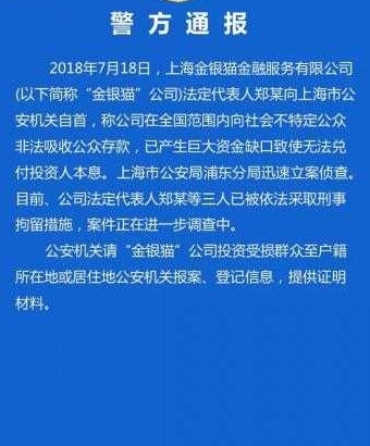 2018年7月18日,上海金银猫金融服务有限公司(以下简称“金银猫”公司)法定代表人郑某向上海市公安机关自首,称公司在全国范围内向社会不特定公众非法吸收公众存款,已产生巨大资金缺口致使无法兑付投资人本息。上海市公安局浦东分局迅速立案侦查。