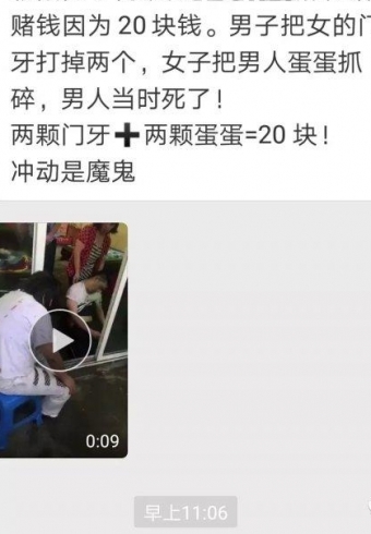 近日,一段视频流传于朝阳人的微信朋友圈,并配有一段文字:" 朝阳剪子胡同某麻将馆,赌钱因为 20 块钱。男子把女的门牙打掉两个,女子把男人蛋蛋抓碎,男人当时死了!两颗门牙两颗蛋蛋 =20 块!冲动是魔鬼。"