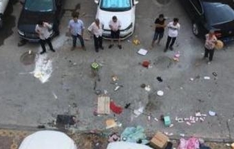 7月20日,郑州沙口路一居民楼三楼窗口不时有物品落下,落地的物品不但有锅碗瓢盆、衣服、被褥,还有椅子、凳子和整箱的药品,甚至连健身器材都被扔了下来。楼下停放的三辆汽车不同程度受损,其中一辆汽车的后挡风玻璃破碎,而被褥和锅碗还留在车身之上。