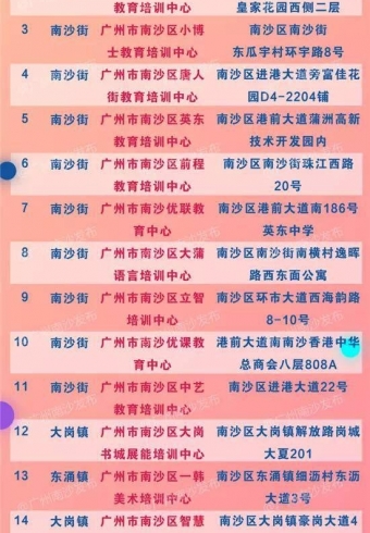 自5月份南沙区组织开展校外培训机构专项治理以来,区内多部门共对辖区内70家多校外培训机构排查造册(除托管、体育俱乐等外),专项治理工作取得了初步成效。截止7月6日,经各镇街资料上报及再次审核确认,培训机构名单“双有”(有照有证机构数)19家和“双无”(
