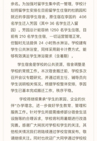 近日,无锡职业技术学院被曝强迫大二学生搬到条件较差的旧宿舍,要求把好宿舍留给留学生住,该校学生们一片哗然,纷纷表示不公平。对此,7月11日,该校在官方微博上发布了《无锡职业技术学院关于近日网络出现学生宿舍调整相关议论的情况通报》。