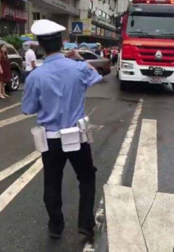 伴随着一阵急促的警报声,一辆消防车剐蹭了两辆违停堵塞消防通道的私家车,并将其“顶开”,随后前往火灾现场驶去。
