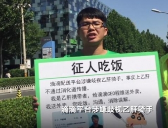 近日,乙肝病毒携带者李机超分别给滴滴CEO程维、美团创始人王兴送餐。此前南昌一位乙肝病毒携带者想成为美团平台配送员,平台要求无"病毒性肝炎" ,其认为平台有歧视乙肝群体之嫌。乙肝互助公益组织"亿友公益"呼吁修改相关规定。滴滴与美团工作人员均收下外卖