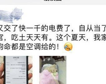 据扬子晚报7月4日消息,最近,刚刚毕业的张某在杭州工作,月薪3千的她因为一个朋友圈引起了不少网友的热议。原来张某家中养了一只宠物狗,担心天气太热于是每天24小时都是开着空调,这导致一个月的电费超高,单单6月就花了近千元的电费。