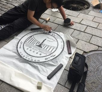 2日,在哈市中央大街上,哈师大书法系的几名学生正在拓片一个检查井的井盖图案。