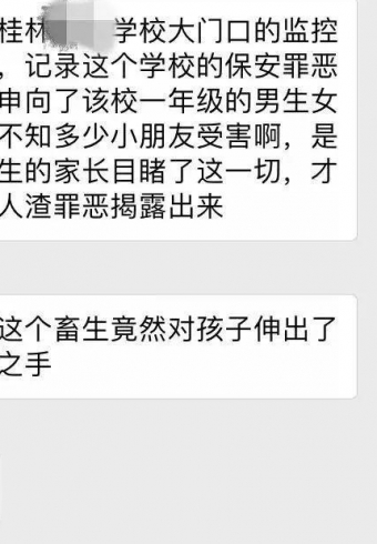 近日,微信群流传一段视频,称是桂林市秀峰区民办学校桂林中美实验学校的男保安,在学校大门口涉嫌猥亵两名小学生。
