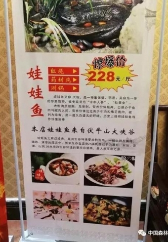 “市区一家饭店打出广告,公开叫卖娃娃鱼,这是不是涉嫌违法?”6月21日,河南漯河市区一饭店打出的广告牌上竟然有娃娃鱼这道菜品,并且宣称娃娃鱼来自伏牛山大峡谷。