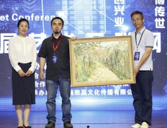 2018年6月21日,第四届艺术互联网大会现场,上海颜文樑艺术促进会副会长、艺微微(ARTVV)共享艺术品联合创始人、青年油画家李靖坤先生将精心创作的作品赠送大会主办方,上海南翔智地副总经理宗柳燕女士代表主办方接受了画作。