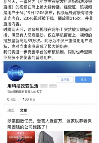 法制晚报·看法新闻(记者 董振杰 罗晓静)6月21日,网上爆出《小学生在家发抖音妈妈洗澡被直播》,一名小女孩在玩抖音时,背景出现其妈妈洗澡画面。抖音回应称该视频是有人恶意推动。突然爆红的抖音出现不少负面声音,对此,抖音一工作人员回应称,抖音有机