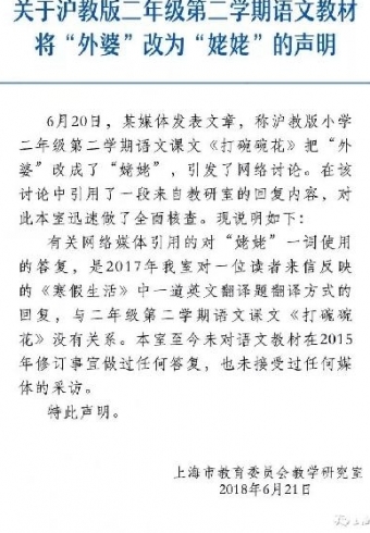 上海市教育委员会教学研究室今日发表关于沪教版二年级第二学期语文教材将“外婆”改为“姥姥”的声明。声明称,网络媒体引用的答复,是2017年研究室对一位读者来信反映的一道英文翻译题翻译方式的回复,与二年级第二学期语文课文《打碗碗花》没有关系。