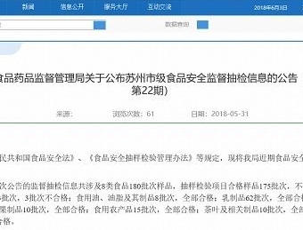 中国质量新闻网讯 5月31日,苏州市食品药品监督管理局官网发布《关于公布苏州市级食品安全监督抽检信息的公告(2018年第22期)》。本次公告的监督抽检信息共涉及8类食品180批次样品,抽样检验项目合格样品175批次,不合格样品5批次。