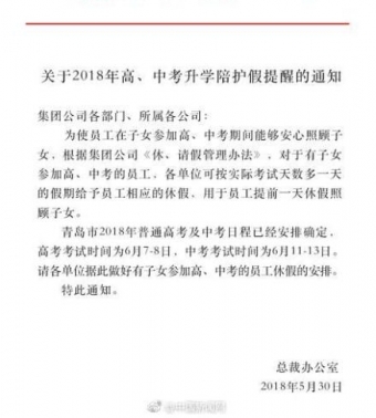 【又是别人家的 家里有孩子高考 员工可放3天假】“今年家里有孩子参加高考中考的公司员工,可放‘比实际考试天数多一天’的假期。”近日,山东青岛海信一则放假通知引发关注。海信表示,这次放假并不是临时起意,在海信内部其实已经实行十多年了。“中考和高