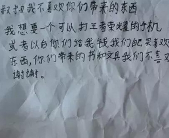 “叔叔我不喜欢你们带来的东西,我想要一个可以打王者荣耀的手机。”近日,国家电网某微信公众号发表的一篇文章中,一张写有上述内容的“小纸条”引发了广泛关注。