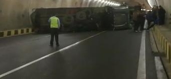 G11鹤大高速大连至鹤岗方向一隧道发生侧翻事故引发道路拥堵