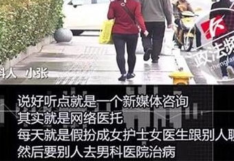 说起医托大家应该都不陌生说的就是把病人从大医院忽悠到小诊所的骗子随着互联网的不断发展医托开始从线下转移到线上……近日,有知情人向特攻记者举报称湖南男博医疗集团雇佣了400名网络医托假扮女医生女护士以恋爱、甚至色诱的方式来招揽“患者”。