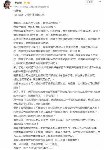 凤凰网娱乐讯6月26日,有韩国第一女主播之称的尹素婉疑似控诉熊猫TV,在微博发出一封《TO。 熊猫TV领导“王思聪先生”》的公开信。对此网友纷纷表示震惊:“厉害了,