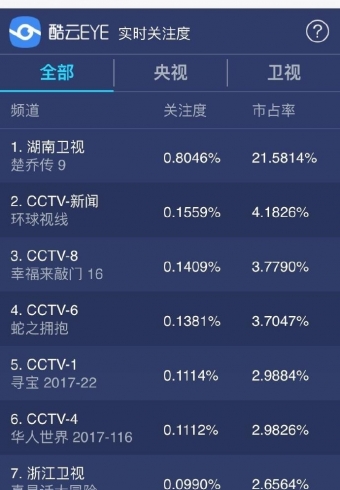 #赵丽颖#领衔主演《楚乔传》今晚实时收视再创新高,远远甩开其他所有频道排名全国第一名,傲世群雄。其中酷云EYE突破0.8大关,再创《花千骨》之后湖南卫视周播剧场的收视巅峰,果然能够复制赵丽颖周播剧女王辉煌成绩的也只有她自己了。恭喜赵丽颖,恭喜楚乔传