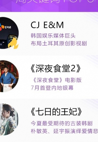 CJ E&M将在土耳其设立分公司;《恶女》销往全球136个国家和地区;《深夜食堂2》将于7月在内地公映;《七日的王妃》首播收视率5.4%;《校对女孩河野悦子》将推SP特别版;《琉璃庭院》《我的丈夫不能工作》等影视剧确定上映、播出日期。