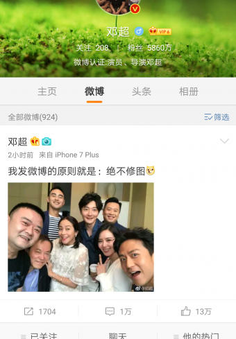 逗比邓超又出来黑人了!6月2日晚上,邓超通过微博发了一张照片并说道:我发微博的原则就是绝不修图!照片中有刘诗诗、阮经天、郭京飞等人,从照片中可以看到不修图的诗诗也依旧这么美!网友们看到后也纷纷说到:诗