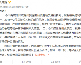 (北京时间记者 刘清 综合报道)5月29日晚,被曝因欠赌债被新加坡赌场起诉的孔令辉通过微博作出回应,称系亲朋好友与该赌场发生债务纠纷,与自己无关。