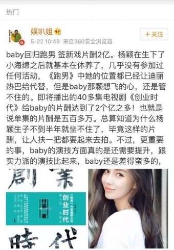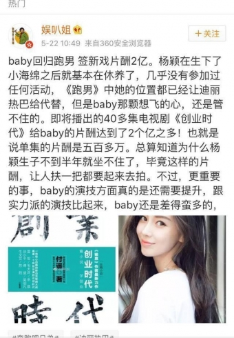 目前,angelababy被爆与黄轩合作的新戏《创业时代》,片酬高达500万一集,整部剧片酬2.2亿左右。