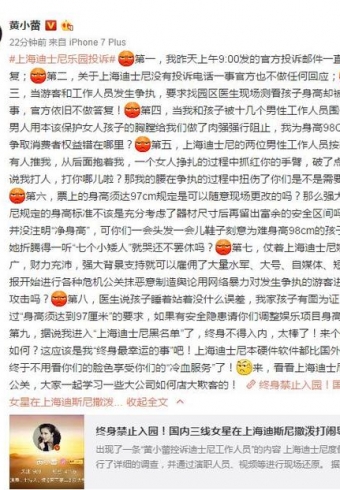网易娱乐5月25日报道 5月24日,演员黄小蕾发文,投诉上海迪士尼度假区《七个小矮人》矿车项目的工作人员,她称该工作人员“全程没有笑容,工作态度冷漠无情,故意刁难,不诚实!”反复刁难身高符合标准的孩子,找理由称身高不达标。同日下午,一名自称是迪士