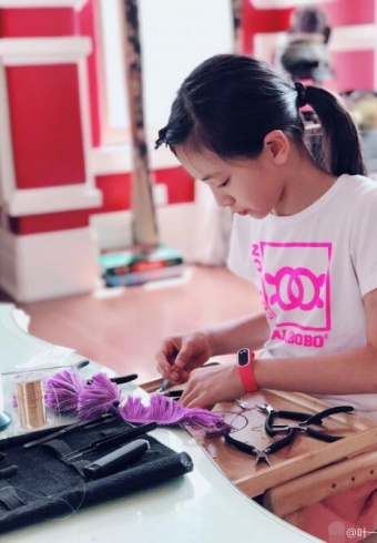 5月21日,叶一茜在微博上晒出了女儿森碟设计并制作耳环的照片,网友纷纷评论:"森碟侧颜美炸!越来越心灵手巧了!"在妈妈的镜头下,女汉子安静下来,变成小淑女,照片中的森碟低头在为妈妈