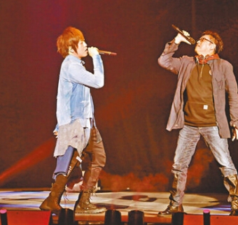 校长跟五月天合唱《脱胎换骨》。新浪娱乐讯 北京时间5月18日消息,据香港媒体报道,台湾天团五月天[微博]的《人生无限公司演唱会》香港站前晚来到第5场,特别邀请谭咏麟[微博](校长)再来当嘉宾。五月天跟校长认识十多年,缘分始于2005年9月,五月天首次来港