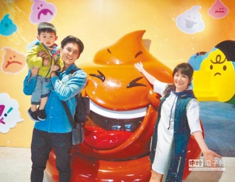 罗美玲(右)带老公、儿子“小吉羊”看便便展。新浪娱乐讯 据台湾媒体报道 罗美玲[微博]日前与健身教练老公Terry带着儿子“小吉羊”去观赏便便展,“小吉羊”1岁7个月大,聪明活泼,看到便便形状的玩具爱不释手,让罗美玲很好奇,随手拿起便便球K老公,请老公