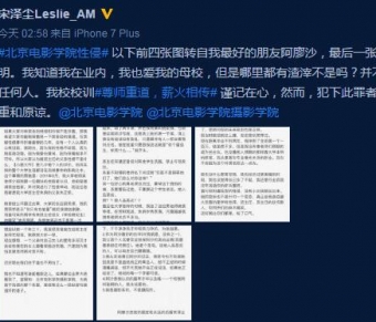 5月10日凌晨2:58,微博认证为“畅毅文化艺人事业部总经理”的宋泽尘Leslie_AM发布内容称,好友“阿廖沙”在北京电影学院就读期间,遭遇班主任父亲