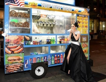 49岁的席琳身着黑白长礼服站在小吃摊前,手拿热狗吃的正香。她配文说:“无价享受!深夜纽约街头穿礼服吃热狗。”