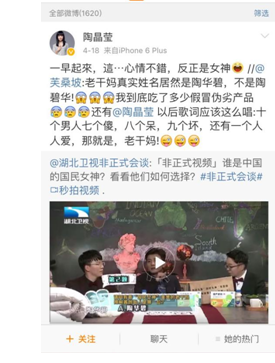 近日,台湾著名演员陶晶莹不幸躺枪,在一段视频中被11名老外集体指认为:中国“老干妈”。陶晶莹看完后,还不忘微博转发评论:“一早起来,这...”省略号里暗含了无限意味和五味杂陈,但生活依然要往下过,随后又补一句:“心情不错,反正是女神。”来自我安