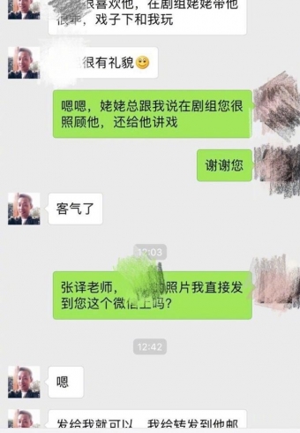张译曝光骗子以他的名义冒充副导演,和网友聊天截图,聊天中“演员张译”向对方索要资料和照片。