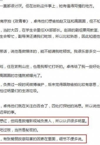 卓伟凭借曝光白百合大发横财,白百合却如过街老鼠,儿子元宝以泪洗面,丈夫陈羽凡无限期退出娱乐圈,这其中的反差让人觉得像是在导演一部戏。果不其然,猛料果然如期而至,卓伟工作室有人出面澄清,白百合确实被卓伟与张爱朋合伙陷害。让人感觉匪夷所思,好像