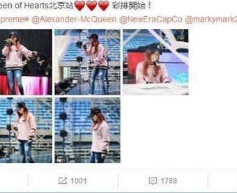 4月14日下午18点41分,邓紫棋在微博晒出一组北京站演唱会的彩排照。照片中,邓紫棋戴着鸭舌帽,身穿粉白色红色卫衣和破洞牛仔裤,脚穿白色休闲运动鞋,正在舞台上认真的排练着。