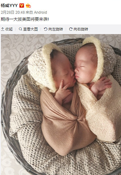 杨威晒出双胞胎女儿的写真萌照,并称:期待一大拔美图将要来袭! 照片中,两个小公主被纷纷裹住,双眼紧闭睡得非常的香甜,不过仍然紧紧挨在一起,左边的小公主在睡梦中还比出V字的手势,十分可爱。