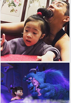 王大陆晒在微博晒出了几张吃孩子的照片。照片中,王大陆张着大嘴,这气势是要把小女孩儿丸子头都要吞下去了。