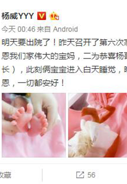 杨威在微博晒出宝宝脚丫照:明天要出院了!昨天召开了第六次家庭会议,由杨哥哥主持,两个议题,一为感恩我们家伟大的宝妈,二为恭喜杨哥哥有了两个副秘书长(他是我们家秘书长)。