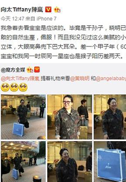黄晓明与Angelababy的爱情结晶小海绵昨日(1月17日)出世,黄晓明父母荣升奶奶和爷爷,二人与一名女子乘七人车到达医院探望Baby和孩子,二人都手拿袋子,估计是食物。