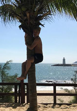 1月3日,贾乃亮在微博晒出一家三口度假的照片。照片中,他穿泳裤爬树与老婆合照,遭李小璐嫌弃,只好给她打上马赛克。