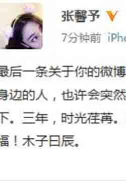 张馨予发文在微博祝福李晨恋情,说道:“最后一条关于你的微博:有时候你以为一辈子在身边的人,也许会突然消失,甚至来不及抱一下。三年,时光荏苒。不管外界怎么看。