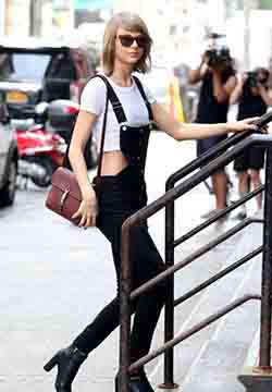 泰勒穿黑色背带裤搭纯白超短top露蛮腰 脚踩黑色粗跟短靴帅气星范足